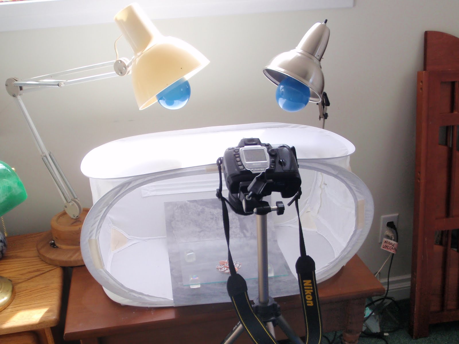 I get asked a lot about my photo set up. So here it is. As you can see I use a photo tent 90% of the time. For the most part I like it but sometimes if a piece is too big or the lighting is off I use a white piece of rip stop nylon hung over a frame work of some sort instead of the photo tent. The photo tent frame work can cause shadows and is obviously limited by size.
